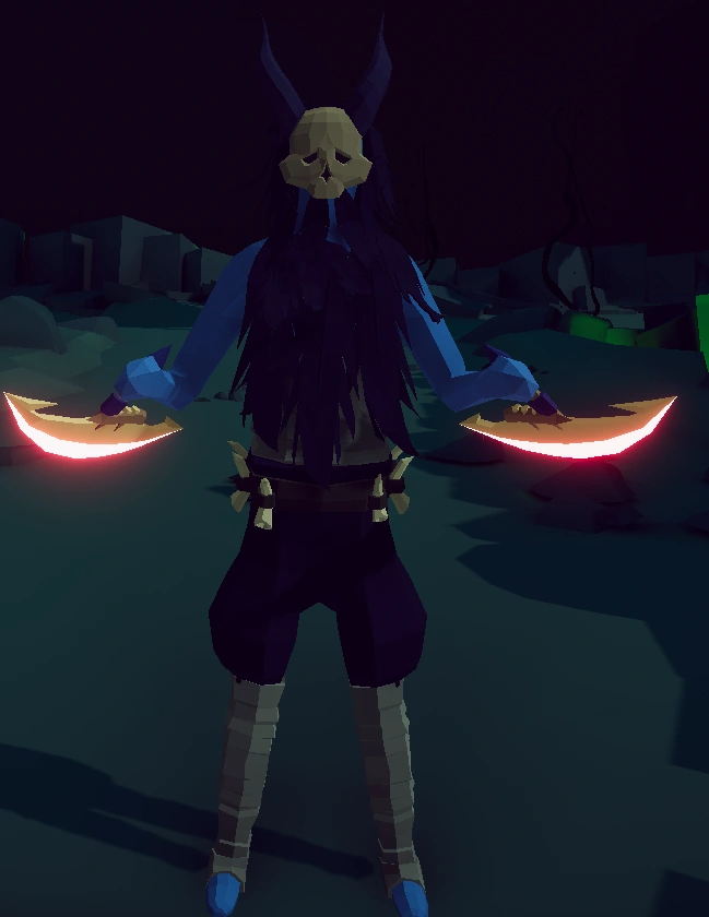 Имеет на голове много перьев и маску в виде черепа с демоническими рогами. Носит пояс с костями, а в руках держит два светящихся клинка.