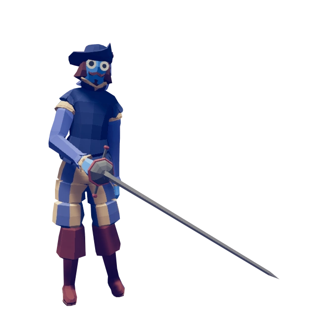 Фехтовальщик выглядит как селянин в шляпе с перьями и одежде из кожи. Он владеет рапирой с рукояткой.